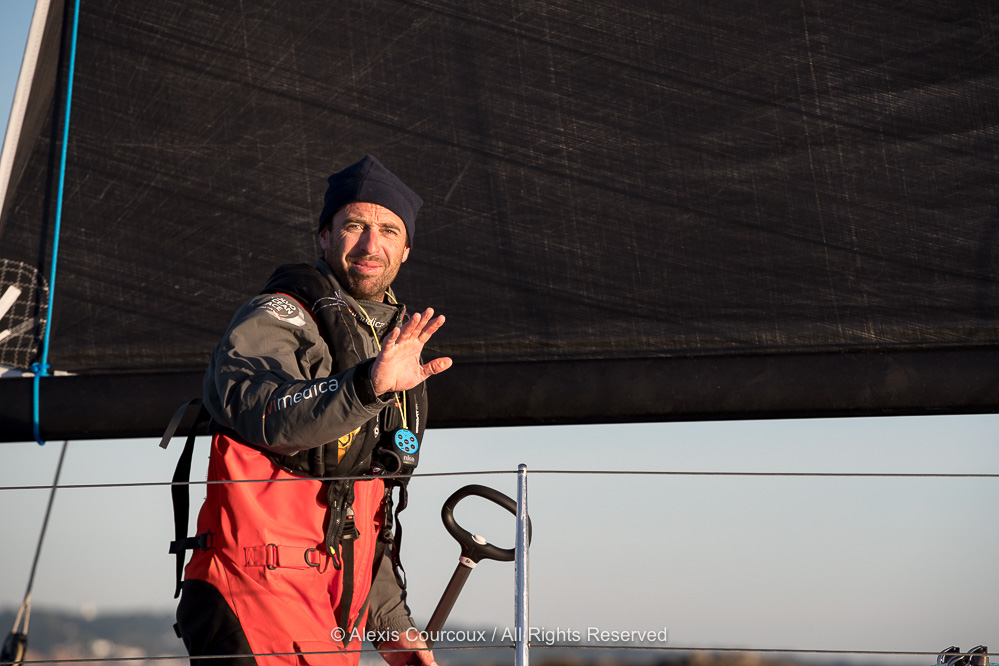 Martin Le Pape (Skipper Macif 2017), deuxième sur la ligne d’arrivée de Concarneau :